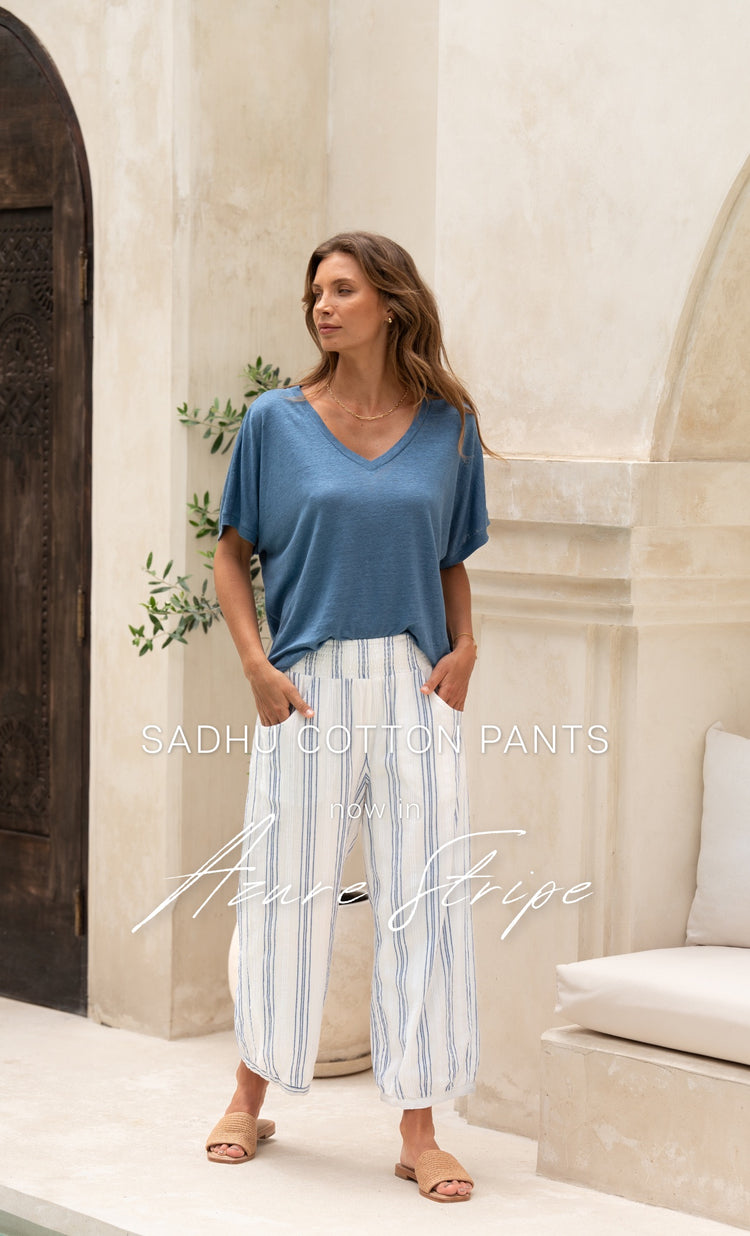 Meet our best-selling Sadhu Cotton Pants in Azure Stripe, a brand-new colour and a limited edition. Azure Stripe brings a fresh coastal lightness to the silhouette our women reach for on repeat. Relaxed, packable, and made for travel and everyday ease. Once it's gone, it might not be coming back.