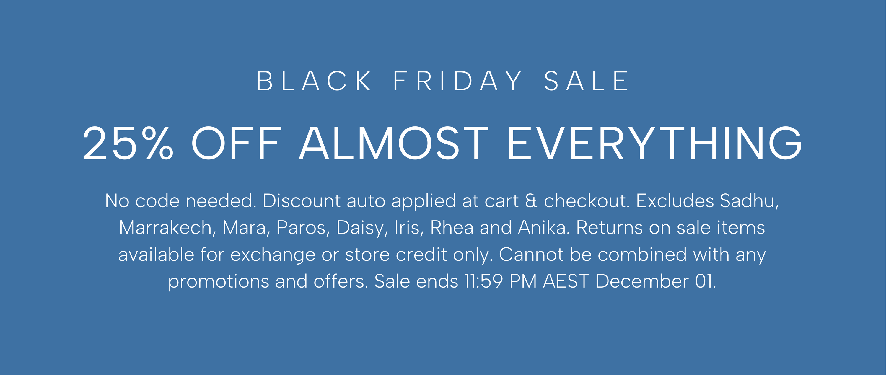 Black Friday Sale | 25% OFFTopsBottomsDressesNew ArrivalsColoursCollectionsLoungewearAccessories